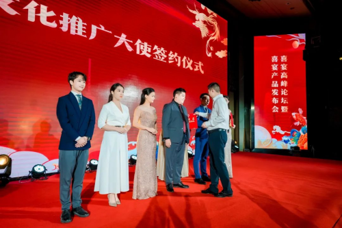 在發(fā)布會期間,小角樓與多方合力,不斷拓展“喜事喜宴喜酒”的多維引領(lǐng)覆蓋面,更與河南廣播電視臺主持團隊“六六大順主持團”正式簽約,將宴會氣氛推向高潮。