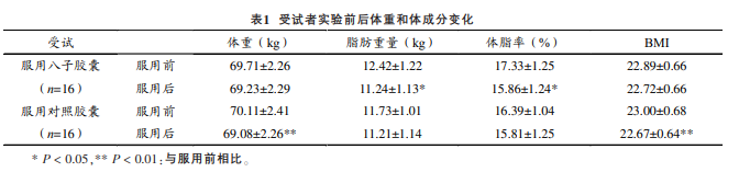 國家體育總局運動醫(yī)學(xué)研究所的一項針對男子足球運動員賽前準備期和比賽期血液生化指標和運動能力的研究表明,服用八子補腎膠囊受試者實驗后,脂肪重量和體脂率較實驗前明顯降低[3](見表1)。