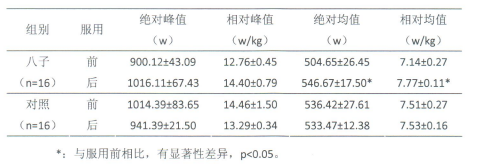 在減少脂肪含量的同時,還要注意增加肌肉量。這里要關(guān)注一個指標,無氧運動能力。無氧運動能力是人體基本運動能力之一,主要反映機體骨骼肌在不同運動階段短時快速激烈運動的一種運動能力。來自國家運動營養(yǎng)測試研究中心的一項實驗報告表明,服用“八子補腎膠囊”后運動員的無氧功率平均值和相對無氧功率平均值明顯升高,說明“八子補腎膠囊”可以提高無氧運動能力[6](見表2)。