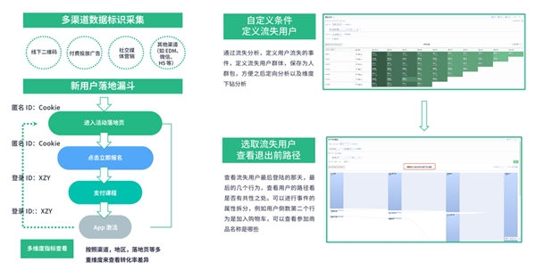 第二,接得住,即流量承接方式的優(yōu)化效率。投放物料效果的好壞,會直接影響轉(zhuǎn)化率和獲客成本,最合理的評估方式是通過 A/B 測試,快速迭代和優(yōu)化落地頁。另外,神策數(shù)據(jù)職業(yè)教育 & 素質(zhì)教育解決方案能夠?qū)崿F(xiàn)新用戶從站外到站內(nèi)行為路徑貫通,有效定位線索流失原因,進(jìn)而調(diào)整承接策略。