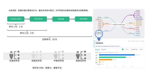 當(dāng)學(xué)員與課程產(chǎn)品交互越多,用戶畫像就會越豐富,班主任對學(xué)員的復(fù)購、進(jìn)階意向也就掌握得更精準(zhǔn),通過量化學(xué)員關(guān)鍵行為,及時(shí)跟進(jìn)高意向?qū)W員,并對不同群體采取差異化銷售策略,以此提高學(xué)員復(fù)購率。