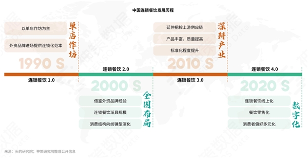 中國連鎖餐飲發(fā)展經歷了“單店作坊、全國布局、深耕產業(yè)、數字化”四個階段,目前已經進入 4.0 數字化階段,呈現線上化、零售化、消費者偏好多元化的趨勢。