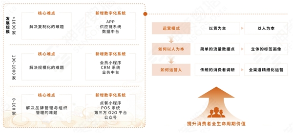2、在實現消費者全生命周期價值運營時,不同規(guī)模的連鎖餐飲品牌需關注不同的重點:小而美的企業(yè)聚焦數字化鏈條前端板塊,規(guī)模化的企業(yè)更聚焦雙中臺的搭建。