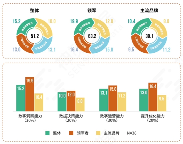 國貨連鎖餐飲品牌的數字化營銷能力處于中游水平,各領域均有較大提升空間,從細項上來看,國貨連鎖餐飲在【數據決策能力】得分略低,應重點加強;領軍者在模型各方面均較領先,其中【數字洞察能力】和【數字運營能力】是關鍵;主流品牌的數字化營銷能力還偏弱,各領域的建設力度均不夠。