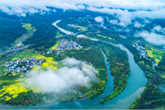 青和綠,代表著春天和希望。汪口的一彎春水比天空還要明凈,乘著竹筏順江而下,和著潺潺溪流聆聽春天的腳步。這一刻兩岸青綠山河成了永恒。青綠千載,山河無垠。