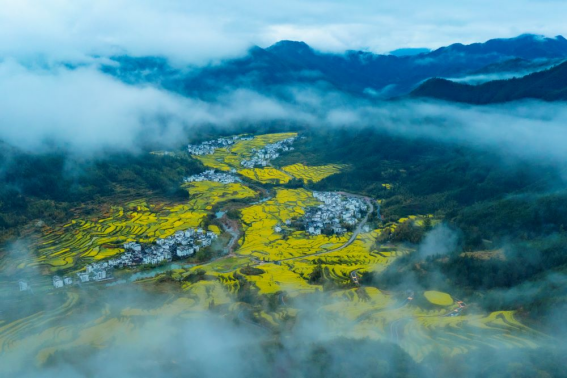清風吹拂金波涌,飄溢醉人濃郁香,在“中國四大花海”之一的江嶺梯田,漫山遍野的油菜花隨著梯田彎曲的線條蜿蜒至遠方,猶如金蛇舞動。煙雨中的江嶺,空氣中飄散著清新的泥土氣息和油菜花的清香,置身江嶺梯田,遠遠望著民居與花海仿若仙,朦朧夢幻?!@正是在婺源江嶺這幅水墨江南畫里,讓我們無比渴求的,仿佛從畫中來,帶著水墨香。