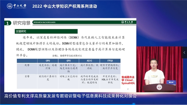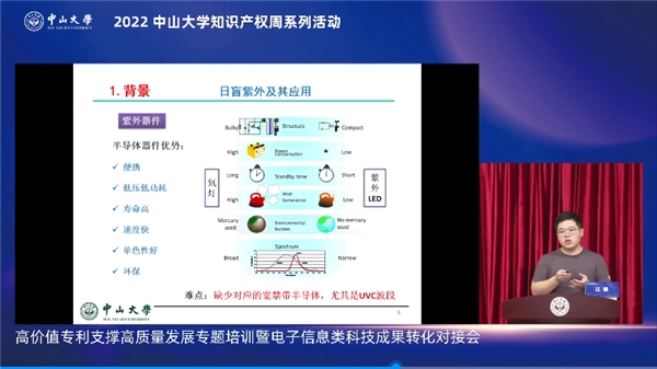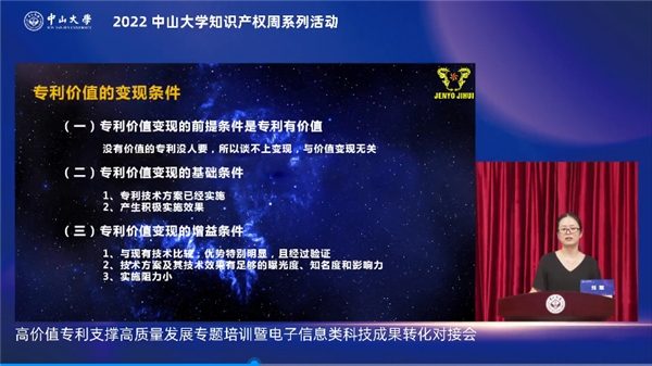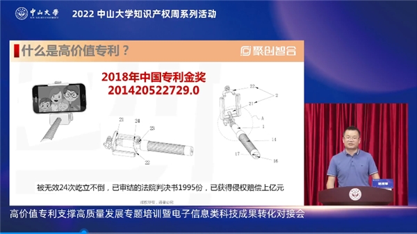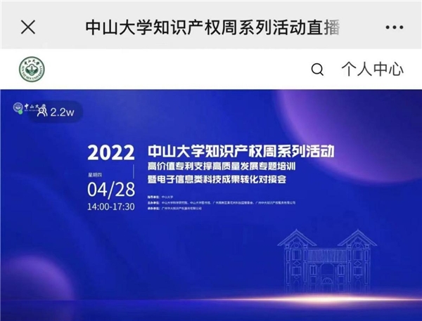 2022年4月28日,在中山大學(xué)的全程指導(dǎo)及越秀區(qū)政府的鼎力支持下,中山大學(xué)科學(xué)研究院、廣州高新區(qū)黃花崗科技園管委會(huì)、中山大學(xué)圖書(shū)館、廣州中大知識(shí)產(chǎn)權(quán)服務(wù)有限公司共同成功主辦中山大學(xué)知識(shí)產(chǎn)權(quán)周系列活動(dòng)高價(jià)值專(zhuān)利支撐高質(zhì)量發(fā)展專(zhuān)題培訓(xùn)暨電子信息類(lèi)科技成果轉(zhuǎn)化對(duì)接會(huì)。本次活動(dòng)采取線(xiàn)上方式開(kāi)展,邀請(qǐng)兩位業(yè)界專(zhuān)家圍繞高價(jià)值專(zhuān)利支撐高質(zhì)量發(fā)展做專(zhuān)題報(bào)告,多達(dá)178項(xiàng)電子信息類(lèi)專(zhuān)利項(xiàng)目與83家企業(yè)進(jìn)行了精準(zhǔn)對(duì)接,活動(dòng)在線(xiàn)人數(shù)超2.2萬(wàn)人,多位知識(shí)產(chǎn)權(quán)專(zhuān)家及知名企業(yè)在云端匯聚,助力知識(shí)產(chǎn)權(quán)高質(zhì)量發(fā)展。