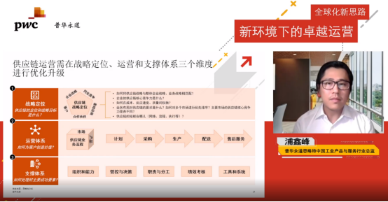 浦鑫峰表示,供應(yīng)鏈正成為企業(yè)實(shí)現(xiàn)全球增長(zhǎng)的重要手段之一,呈現(xiàn)全球化、定制化、智能化等發(fā)展趨勢(shì)。聚焦國(guó)內(nèi)眾多出海企業(yè),現(xiàn)有供應(yīng)鏈體系多面臨短期無(wú)法充分滿足海外市場(chǎng)需求、中長(zhǎng)期無(wú)法更好支撐海外業(yè)務(wù)發(fā)展以及全球化對(duì)供應(yīng)鏈運(yùn)營(yíng)提出的更高要求等挑戰(zhàn)。普華永道結(jié)合成功項(xiàng)目經(jīng)驗(yàn)及行業(yè)洞察,幫助企業(yè)通過(guò)對(duì)供應(yīng)鏈戰(zhàn)略定位、運(yùn)營(yíng)體系和支撐體系三個(gè)維度的優(yōu)化升級(jí),打造端到端卓越供應(yīng)鏈運(yùn)營(yíng)能力,提升運(yùn)營(yíng)效率、實(shí)現(xiàn)規(guī)模經(jīng)濟(jì)效益、并優(yōu)化對(duì)海外業(yè)務(wù)的管理和管控,進(jìn)一步推動(dòng)全球化業(yè)務(wù)發(fā)展。