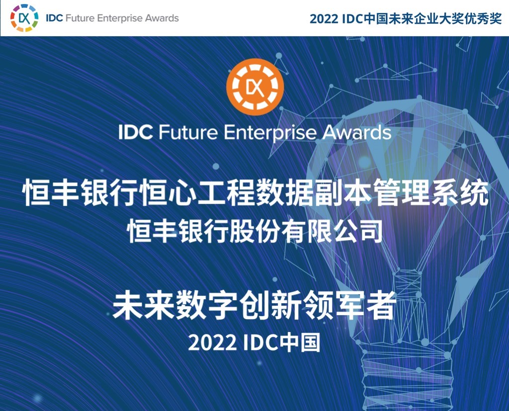 9月1日,IDC中國(guó)正式發(fā)布2022IDC中國(guó)未來(lái)企業(yè)大獎(jiǎng)優(yōu)秀案例獲獎(jiǎng)名單,恒豐銀行憑借恒心工程數(shù)據(jù)副本管理系統(tǒng)項(xiàng)目獲評(píng)“未來(lái)數(shù)字創(chuàng)新領(lǐng)軍者”優(yōu)秀獎(jiǎng)。