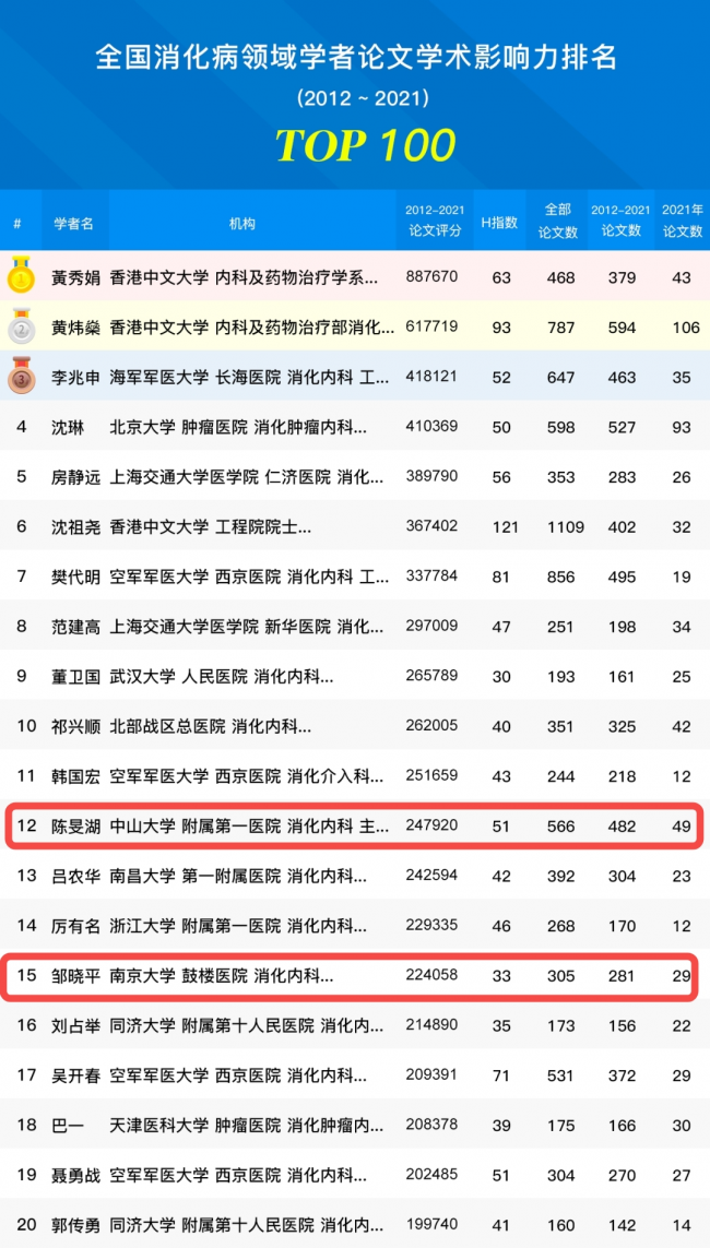 在今年全球?qū)W者庫(kù)發(fā)布的《2012-2021年全國(guó)消化病領(lǐng)域?qū)W者論文學(xué)術(shù)影響力排名》中,泰康醫(yī)療旗下深圳前海泰康國(guó)際醫(yī)院(籌)高級(jí)顧問陳旻湖教授與泰康仙林鼓樓醫(yī)院院長(zhǎng)鄒曉平教授雙雙入選TOP100。其中,陳旻湖教授以H指數(shù)(在一定期間內(nèi)發(fā)表的論文至少有h篇的被引頻次不低于h次)51、全部論文數(shù)566篇,位列全國(guó)總排名第12位;鄒曉平教授則以H指數(shù)33、全部論文數(shù)305篇,位列全國(guó)總排名第15位。