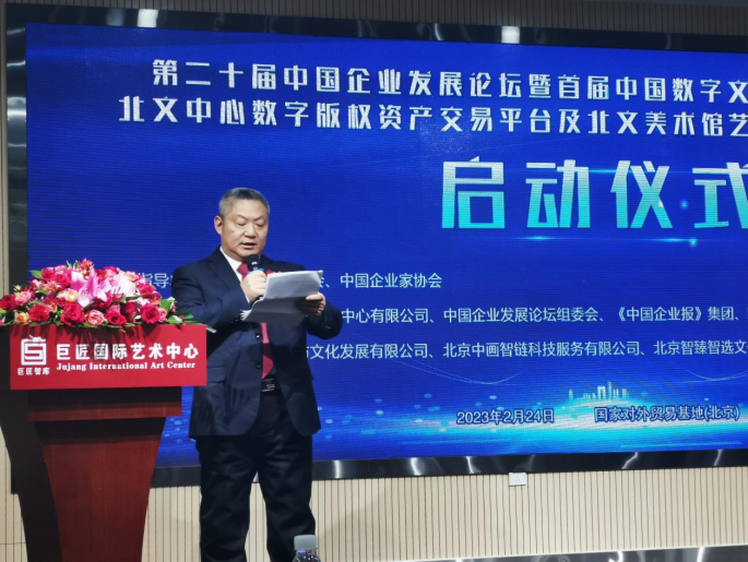 2023年2月24日,第二十屆中國企業(yè)發(fā)展論壇暨首屆中國數(shù)字文化產(chǎn)業(yè)投資高峰論壇啟動(dòng)儀式在國家對(duì)外文化貿(mào)易基地(北京)舉行。與此同時(shí),北文美術(shù)館藝術(shù)品交易服務(wù)平臺(tái)、北文中心數(shù)字版權(quán)資產(chǎn)發(fā)行平臺(tái)啟動(dòng)儀式也如期舉辦。