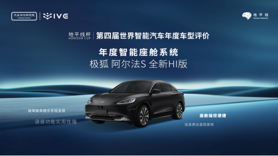 極狐阿爾法S全新HI版榮獲“地平線杯”第四屆世界智能汽車年度智能座艙系統(tǒng)榮譽(yù)稱號(hào)。