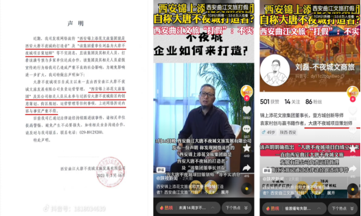 2023年3月16日,大唐不夜城官方率先在抖音、曲江文旅、大唐不夜城、曲江文化、微博、西安大唐不夜城等平臺官方認證賬號上全網(wǎng)發(fā)布聲明,該聲明指出:發(fā)現(xiàn)網(wǎng)絡流傳的“西安“錦上添花”就是西安大唐不夜城的打造者”及“該集團董事長劉磊為大唐不夜城項目策劃師”等不實消息,是假冒大唐不夜城品牌“該集團及其相關人員打著該旗號欲與多家單位達成合作,該集團及其相關人員虛假宣傳行為給我司已造成嚴重不良的社會影響?!?/p>