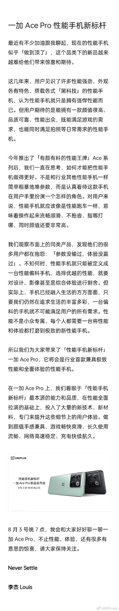 一加 Ace Pro定位“性能手機(jī)新標(biāo)桿”, 一加中國區(qū)總裁李杰表示不知何時,性能手機(jī)就只能被定義為一臺性能偏科手機(jī),選擇優(yōu)越的性能,就要對設(shè)計、影像甚至是綜合體驗(yàn)進(jìn)行割舍。李杰稱:每個人都需要一臺將性能和體驗(yàn)都打磨到極致的新性能手機(jī)。性能手機(jī)新標(biāo)桿一加 Ace Pro,將會是行業(yè)首款兼具極致性能和全面體驗(yàn)的性能手機(jī)。