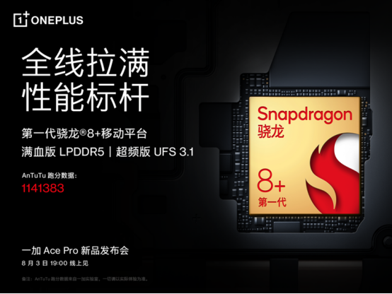 一加 Ace Pro搭載第一代驍龍?8+移動平臺,驍龍8+采用全球領(lǐng)先的臺積電4nm制程工藝,相較上一代CPU和 GPU性能提升10%,同時功耗降低30%,能效比得到顯著提升。驍龍8+搭載第7代高通 AI引擎,AI能效提升20%,釋放更強(qiáng)勁的AI處理能力。一加 Ace Pro還搭載滿血版LPDDR5、超頻版UFS3.1,與驍龍8+協(xié)同帶來更流暢的使用體驗(yàn)。憑借強(qiáng)悍的性能表現(xiàn),一加 Ace Pro在跑分軟件AnTuTu上跑出了1141383的高分。