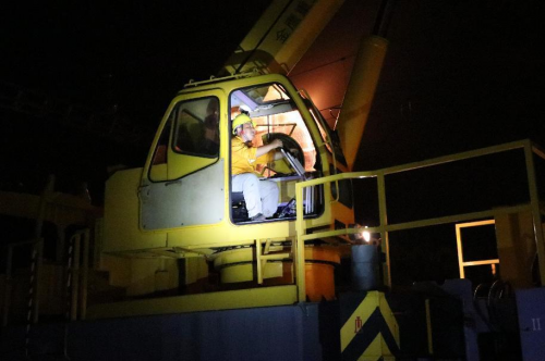2022年9月22日凌晨0點33分,一聲“開工作業(yè)”嘹亮的口號劃破了海口寂靜的夜空,作業(yè)人員根據(jù)分工有條不絮的開始忙碌起來。1點35分隨著吊車吊臂平穩(wěn)落下,一組長23.03米的橫梁穩(wěn)穩(wěn)的落在鋼柱上,作業(yè)人員迅速對位、連接、緊固、落臂……熟練的操作一氣呵成,順利精準完成了海南環(huán)島高鐵首次硬橫梁更換作業(yè)。