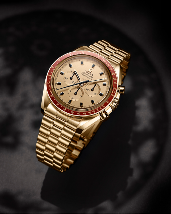 在1969這個(gè)重要年份里,除了隨宇航員登上月球的款式之外,還有一枚非常特殊的超霸表。在當(dāng)年慶祝登月成功的晚宴上,歐米茄捧出了一款黃色18K金限量超霸腕表:金色表盤(pán),勃艮第紅色鋁制表圈,鍍黑指針與時(shí)標(biāo),這是第一枚貴金屬超霸。