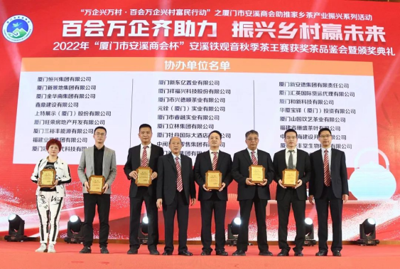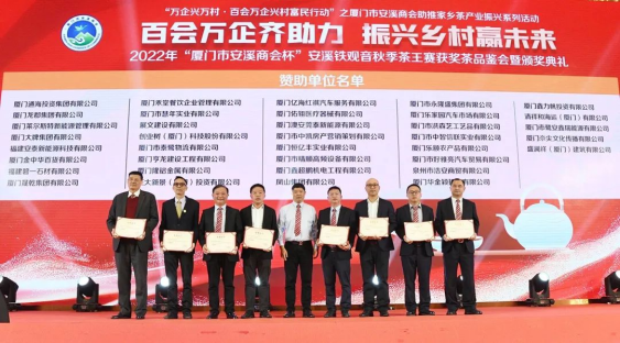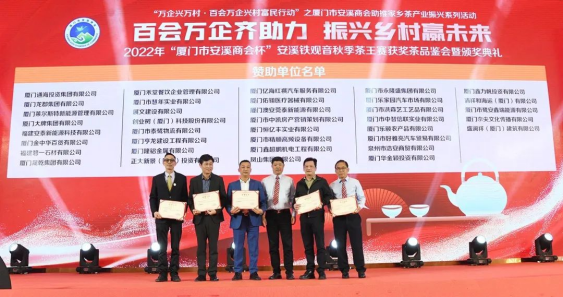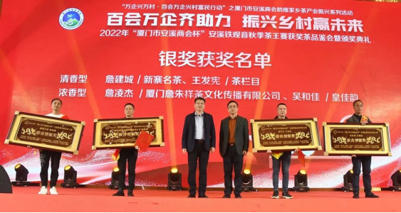 在當(dāng)晚舉行的茶王賽頒獎(jiǎng)典禮上,廈門市安溪商會(huì)為各位獲獎(jiǎng)?wù)哳C獎(jiǎng),為大賽的協(xié)辦和贊助企業(yè)頒發(fā)牌匾和證書。廈門市安溪商會(huì)為茶王賽設(shè)置獎(jiǎng)金高達(dá)百萬元,大賽的舉辦,得到商會(huì)數(shù)十家會(huì)員企業(yè)的鼎力支持。