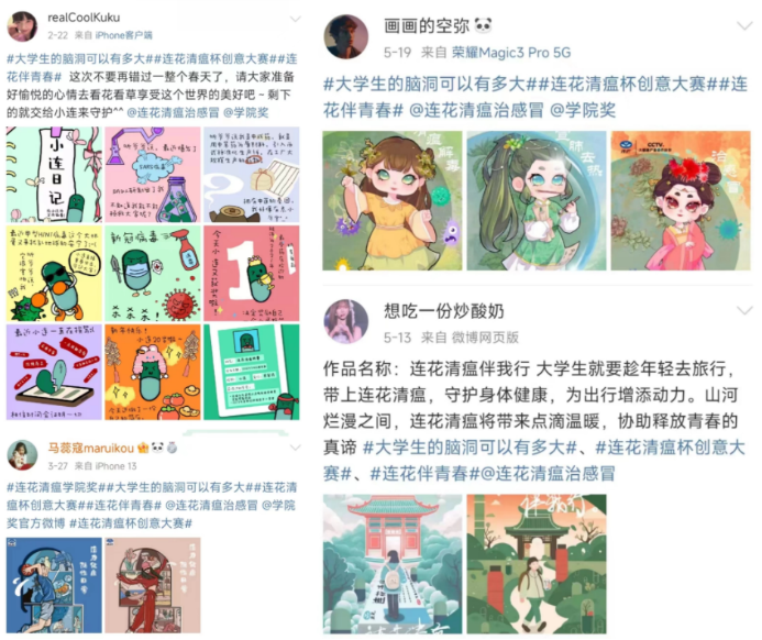 時代在發(fā)展,青年在進(jìn)步,創(chuàng)作新勢力隨著青年一代的熱血成長也在持續(xù)擴大聲量,此次征集到的創(chuàng)意作品高燃展現(xiàn)了Z世代的創(chuàng)意腦洞,賦能連花清瘟無限青春力量。