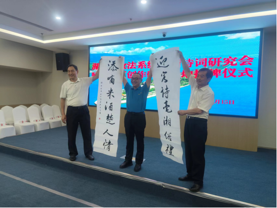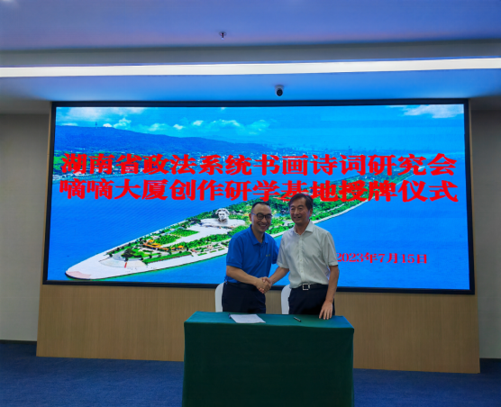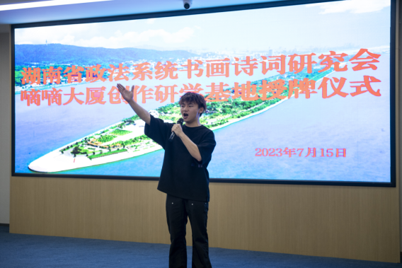 詩以言志,文以化人。以法護(hù)商,以商促文。7月15日上午,坐落于長(zhǎng)沙市芙蓉區(qū)“中央文化區(qū)”的嘀嘀大廈五樓會(huì)議室高朋滿座,熱鬧非凡?!昂鲜≌ㄎ幕粥执髲B創(chuàng)研基地”簽約暨掛牌儀式在此隆重舉行。省政法系統(tǒng)書畫詩詞研究會(huì)主席團(tuán)成員彭對(duì)喜,副會(huì)長(zhǎng)劉慶富;詩詞分會(huì)主席陳嶺及副主席賀曦、周加良、江世炎;書法分會(huì)主席陳祥松、副主席吳若順;長(zhǎng)沙法官文聯(lián)副主席胡軍軍等領(lǐng)導(dǎo)和嘉賓出席活動(dòng)。