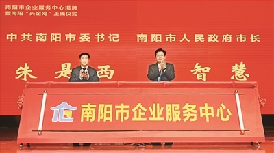 南陽(yáng)市委書記朱是西(右)、市長(zhǎng)王智慧(左)為南陽(yáng)市企業(yè)服務(wù)中心揭牌