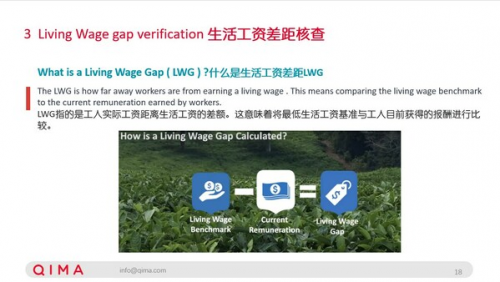 啟邁QIMA 專家同時(shí)提醒,企業(yè)還應(yīng)注意生活工資差距核查,即對(duì)最低生活工資基準(zhǔn)與工人目前獲得的報(bào)酬進(jìn)行比較。該驗(yàn)證遵循IDH驗(yàn)證指南,主要關(guān)注工資和福利,而不是標(biāo)準(zhǔn)的社會(huì)審核。審核方法包括工作情況面談、管理面談、文件審查和現(xiàn)場(chǎng)訪問,并特別注意數(shù)據(jù)準(zhǔn)確性和工作類別。