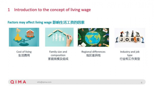 如何確定生活工資?啟邁QIMA專家介紹,生活費(fèi)用、家庭規(guī)模及組成、地區(qū)差異性、行業(yè)和工作類型都是影響生活工資的因素。通常是先確定特定地區(qū)基本但體面生活的成本,包括食物、住房、教育、醫(yī)療保健、交通、服裝、意外開支及其他家庭基本需求。然后將家庭的總成本除以家庭中在職成年人平均數(shù),并考慮其他收入者的貢獻(xiàn),并根據(jù)當(dāng)?shù)貎r(jià)格和類型進(jìn)行量身定制。這個(gè)數(shù)值代表該地區(qū)一個(gè)工薪階層單月的必要實(shí)得工資或凈生活工資。最后,凈生活工資根據(jù)稅收和扣除額進(jìn)行調(diào)整。