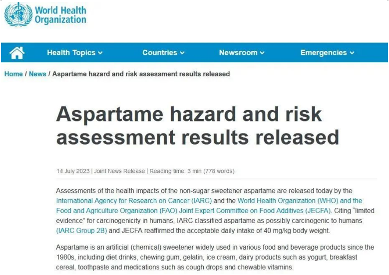 7月14日,世界衛(wèi)生組織(WHO)隸屬的國際癌癥研究機構(gòu)(IARC)和糧食及農(nóng)業(yè)組織食品添加劑聯(lián)合專家委員會(JECFA)公布了阿斯巴甜對健康影響的評估結(jié)果。